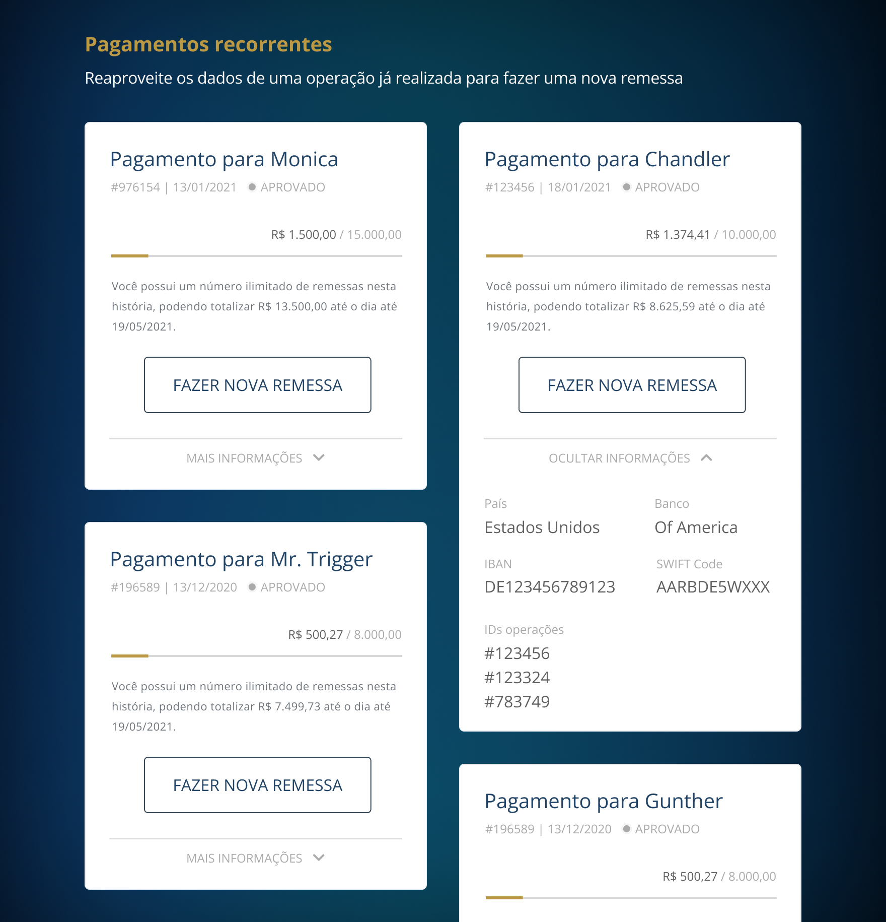 To develop this feature, I met with the product owner and engineering team so we could discuss all the business rules, acceptance criteria and technical limitations. I had to keep in mind I would need to separate completed operations from those in progress and that a few inputs, like currency, type of operation and beneficiary data couldn't change after the first transaction.