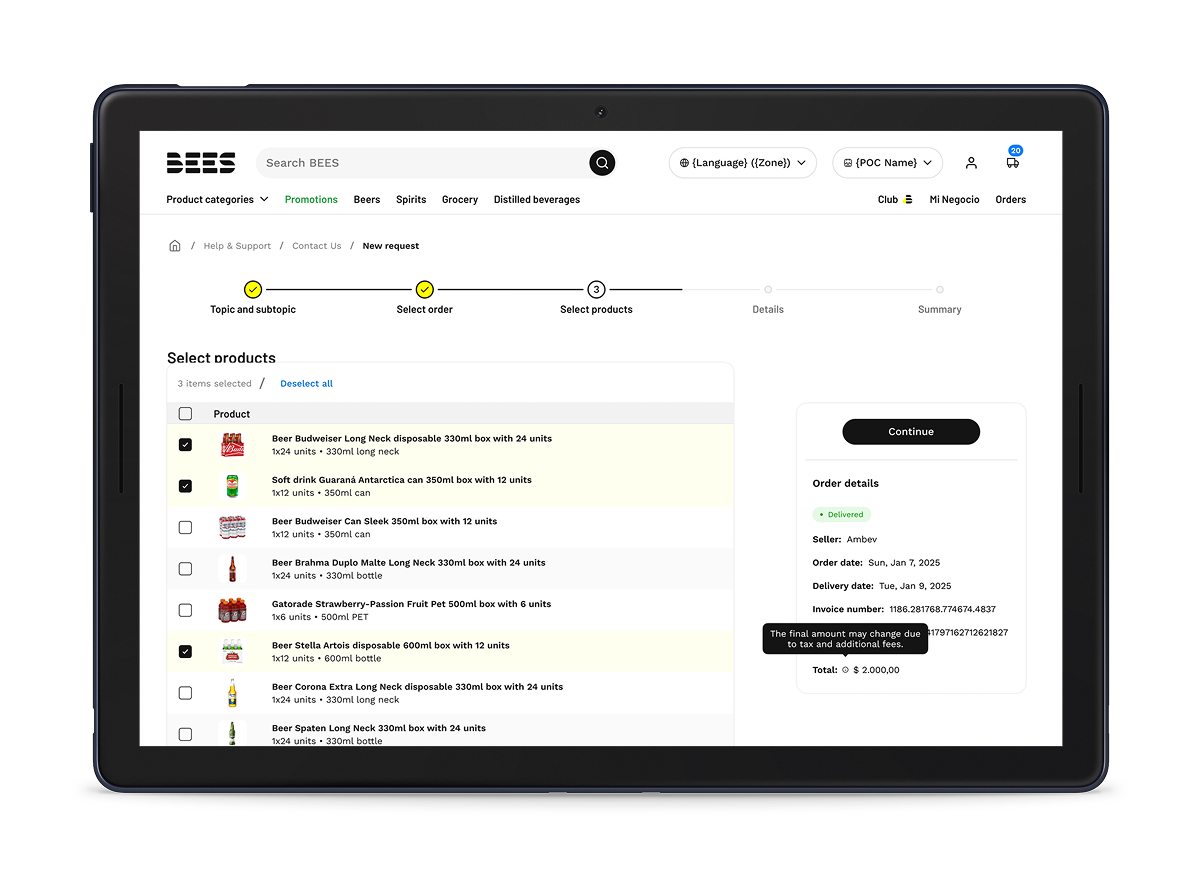 Inside BEES, there's a help and support area called Care. In Care, it is possible – among other things – to access FAQs, chat with agents, and request help by filling out pre-existing forms.